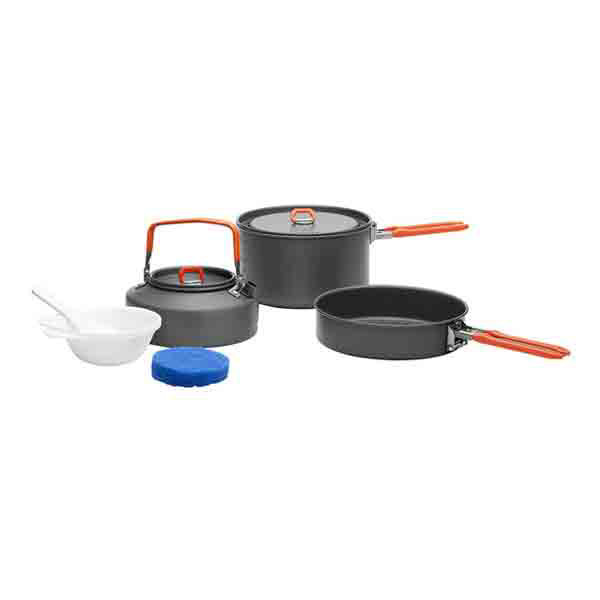 ست لوازم پخت و پز کوهنوردی فایرمپل مدل FEAST 2 شامل ماهی تابه، قابلمه ، یک درب (مناسب قابلمه و ماهیتابه)‌ ، کتری ، کفگیر ،  دو عدد کاسه کوچک و اسکاچ میباشد. این ست ظروف به راحتی قابل حمل می باشند و پک کامل آن داخل کیف توری قرار میگیرد. این ست در داخل هم جا گذاری می شوند تا فضای بسیار کمی را اشغال نمایند و به راحتی در کوله پشتی شما جای گیرند. جنس آلومینیوم سخت با روکش نچسب در این مدل به شما امکان می‌دهد تا علاوه‌ بر اینکه بابت سنگینی ظروف غذای خود مشکلی نداشته باشید، ظرف‌هایتان از دوام بسیار بیشتری برخوردار باشند و در کنار آن، بابت چسبیدن غذا به ته قابلمه یا ماهی‌تابه‌ ی خود هم نگران نباشید. کتری این مجموعه دارای دسته‌ی فلزی با روکش پلاستیکی است که امکان جابه‌جایی راحت‌تری را برای شما فراهم کرده است؛ همچنین دسته‌ی قابلمه و ماهی‌تابه‌ی ظرف غذای فایرمپل مدل  Feast 2 فلزی با قسمت مخصوص نگهداری دست، از جنس پلاستیک نسوز است و تاشو و قفل دار می باشند.